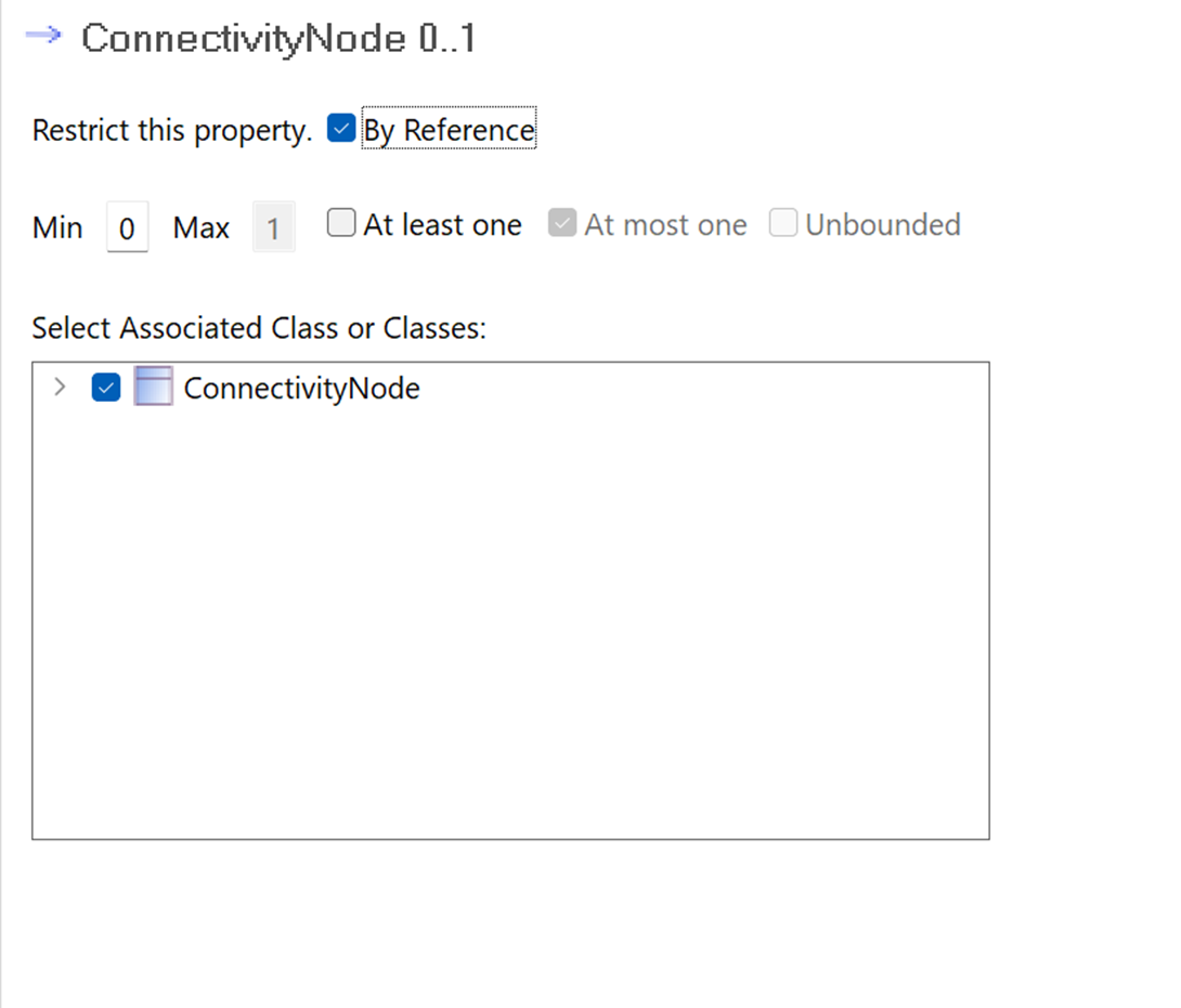 It is important to do a few things here. One is to check the box under Selected Associated Class or Classes. Only ConnectivityNode should be there for this example, but it’s possible for multiple classes to be here depending on the profile. Next, make sure to check the box saying that says By Reference to avoid any circular references in the schema.