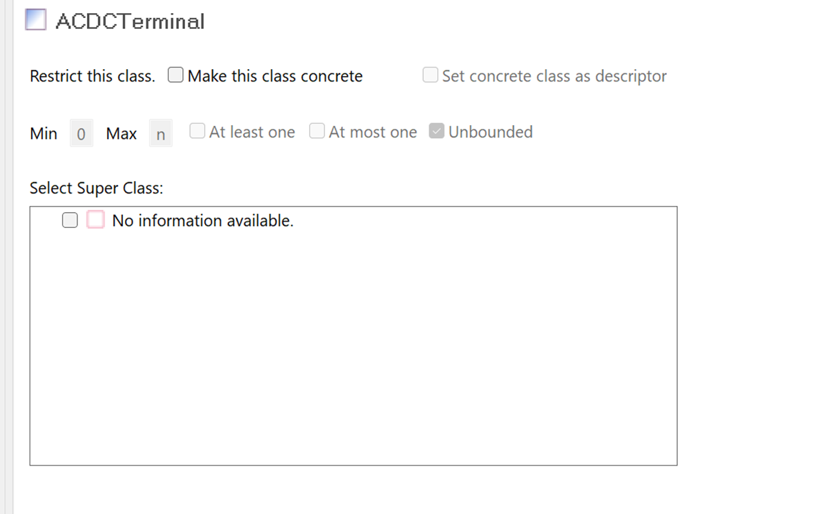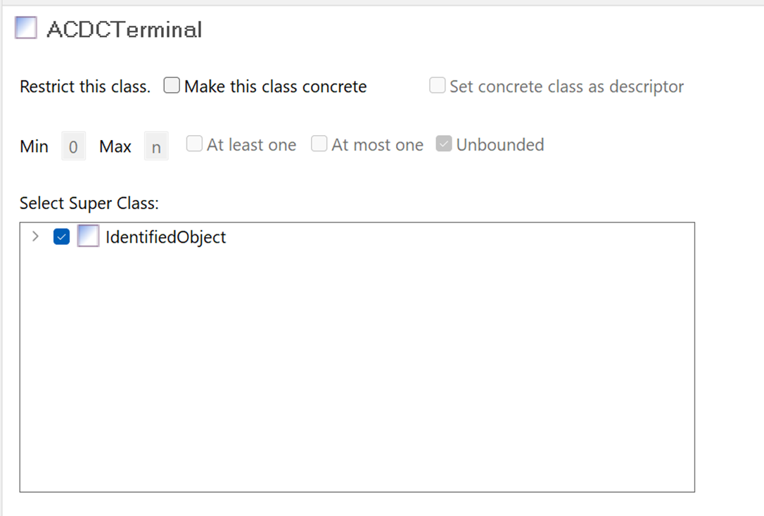 IdentifiedObject will be now be added following the same steps outlined earlier. It will have the attributes mRID, description, and name, with mRID being required. Upon being added, checking the restrictions page of ACDCTerminal confirms that it now inherits from IdentifiedObject and thus will have those same attributes.
