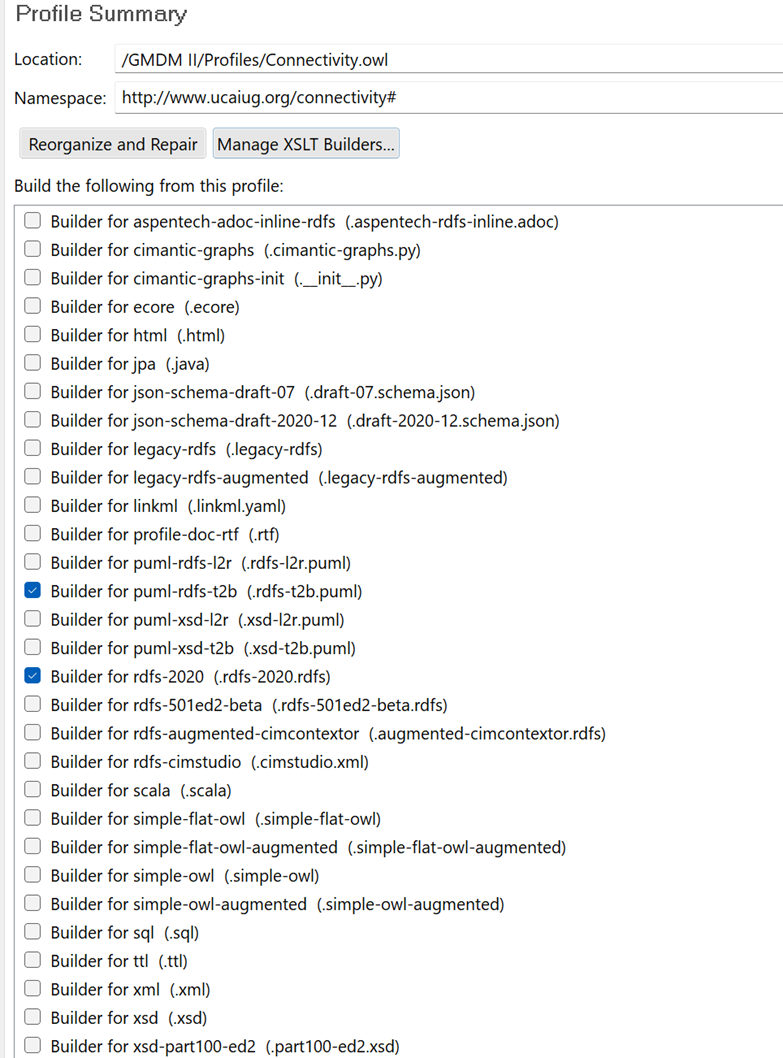 Now that the profile has been defined and the message structure has set, CIMTool will generate the required artifacts. As an RDF schema is desired, one of the RDF builders will be used to create the resulting RDFS file. In addition to that, one of the PlantUML builders will be selected to get a UML view of the profile to give a visual and confirm that it looks as expected.