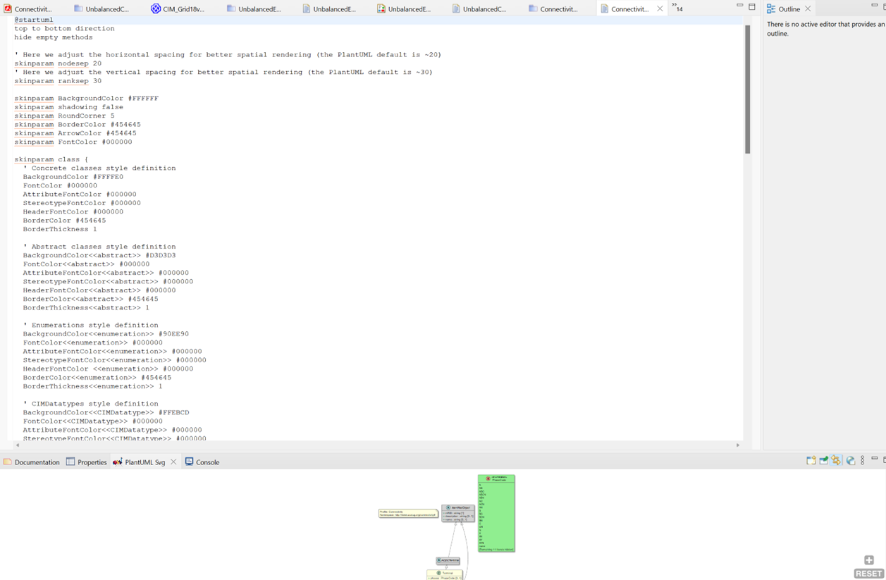 As seen in Figure 7 15, the correct classes are marked as concrete versus abstract and additionally, there are no red association lines, which would indicate an error in CIMTool. Everything looks great so far and now more classes can be added to the profile. With each change, simply save the profile to regenerate new PlantUML and RDFS, and repeat previous steps as needed until satisfied with the resulting profile.