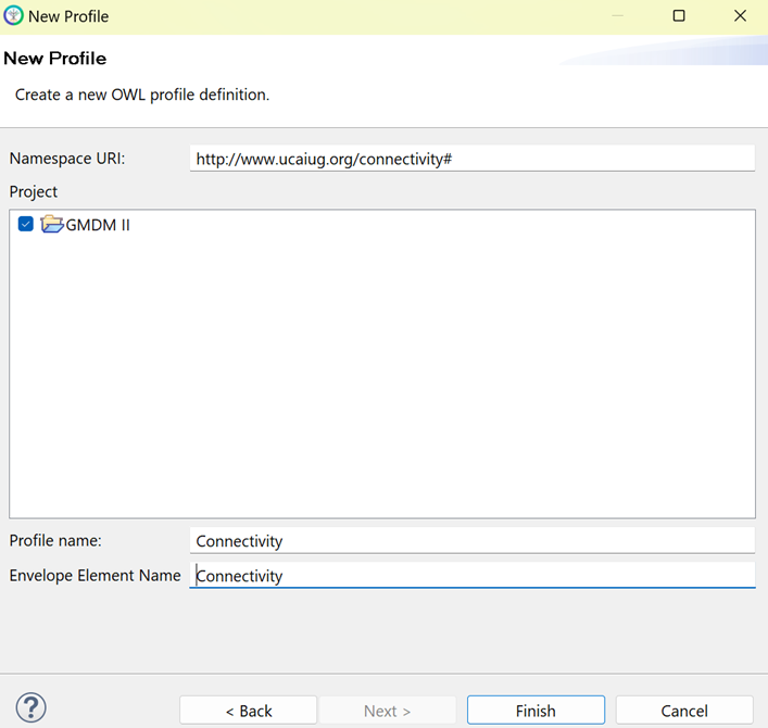 In Figure 7 3 is an example of a New Profile dialog box. Each profile has a namespace Unique Resource Identifier (URI) which in this case has been set as http://www.ucaiug.org/connectivity#. The Profile Name is used to name the profile within the workspace and the Envelope Element Name typically defines the root of the message itself. However, since this is being used to generate RDFS instead of XML schema, this will not actually be used for that purpose.