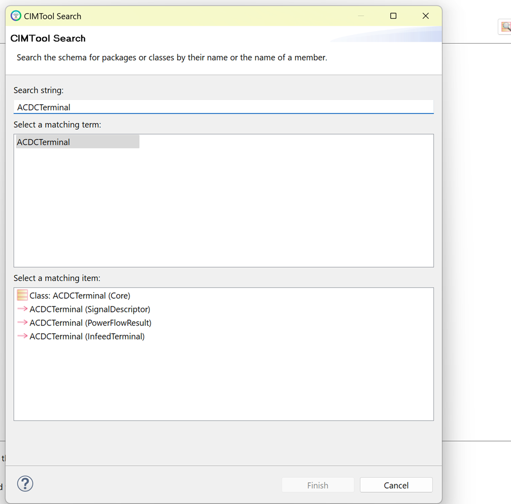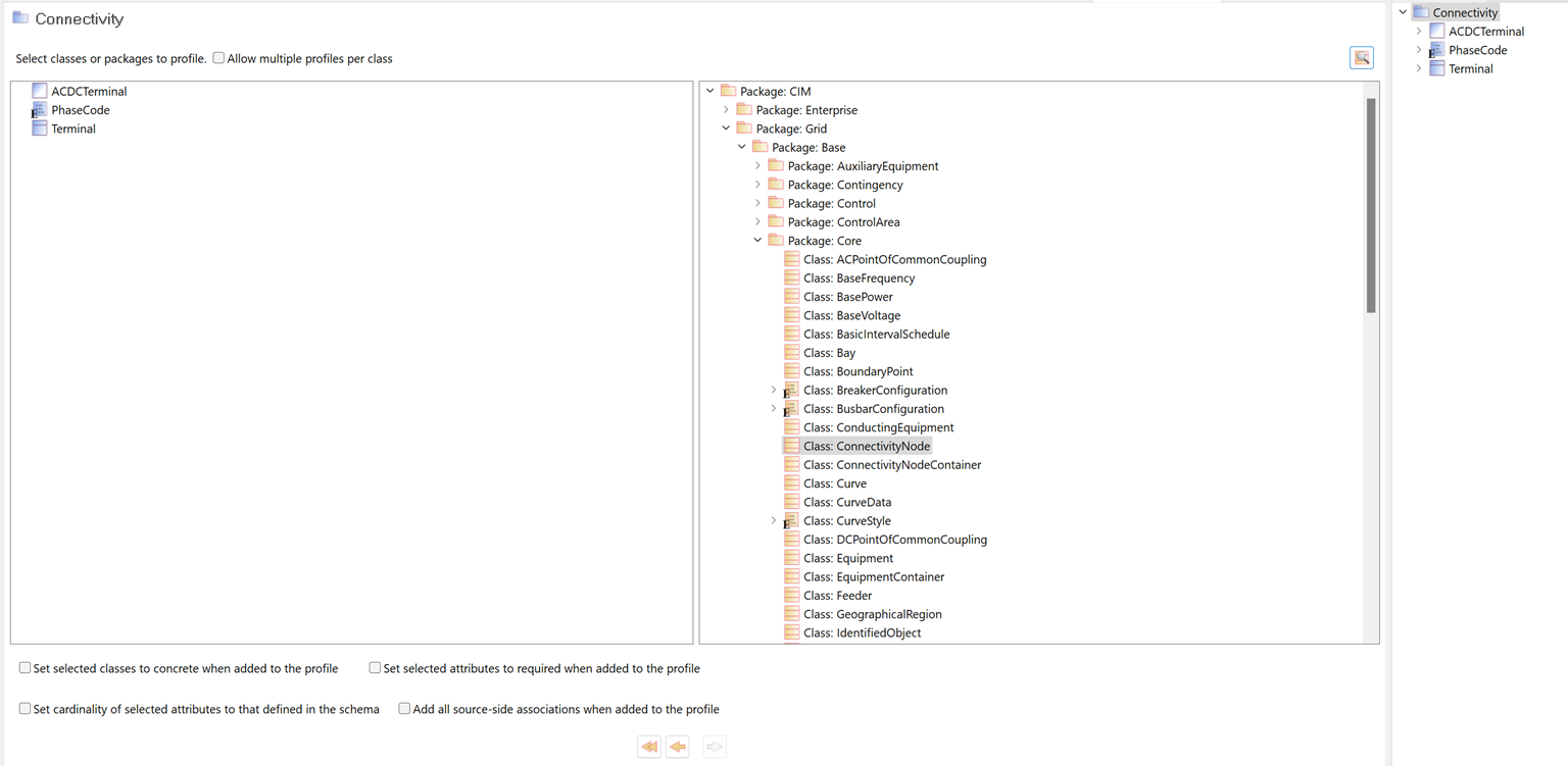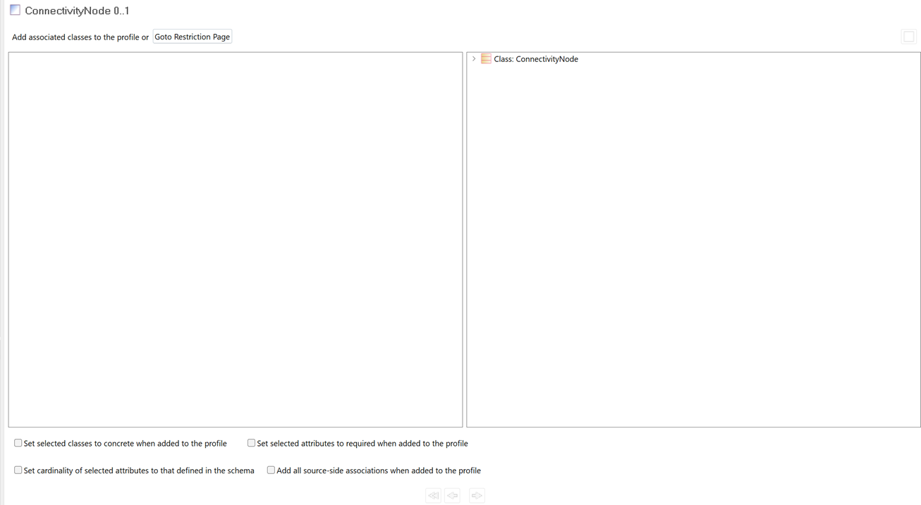 To add Terminal, the same steps as above will be performed. The class will be searched, the left arrow will be used to draw it into the profile, and from there things will look just slightly different. Since this is a concrete class, it must be set as such using the Restrictions tab in CIMTool.