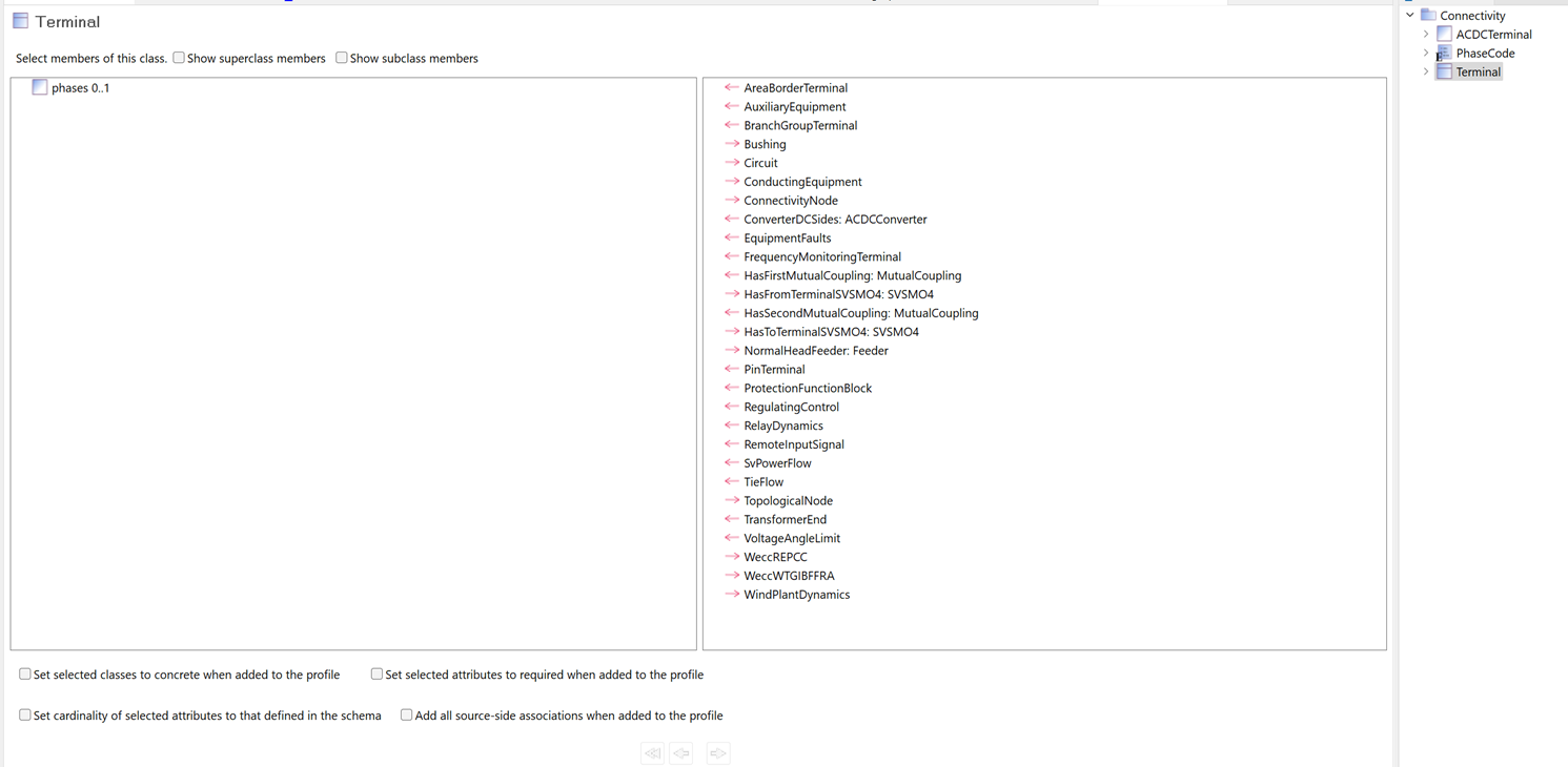 In this case, the only attribute that is being added to Terminal is phases. Since phases is an enumeration, adding it in CIMTool works slightly different. Enumerations in the CIM are modeled as classes, so not only does phases have to be brought in, but the PhaseCode class also must be added. To do this in the least amount of steps, simply use the double arrow icon to add this particular attribute.